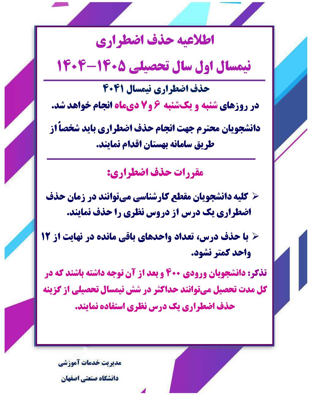 اطلاعيه حذف اضطراري نيمسال اول سال تحصيلي 1405-1404