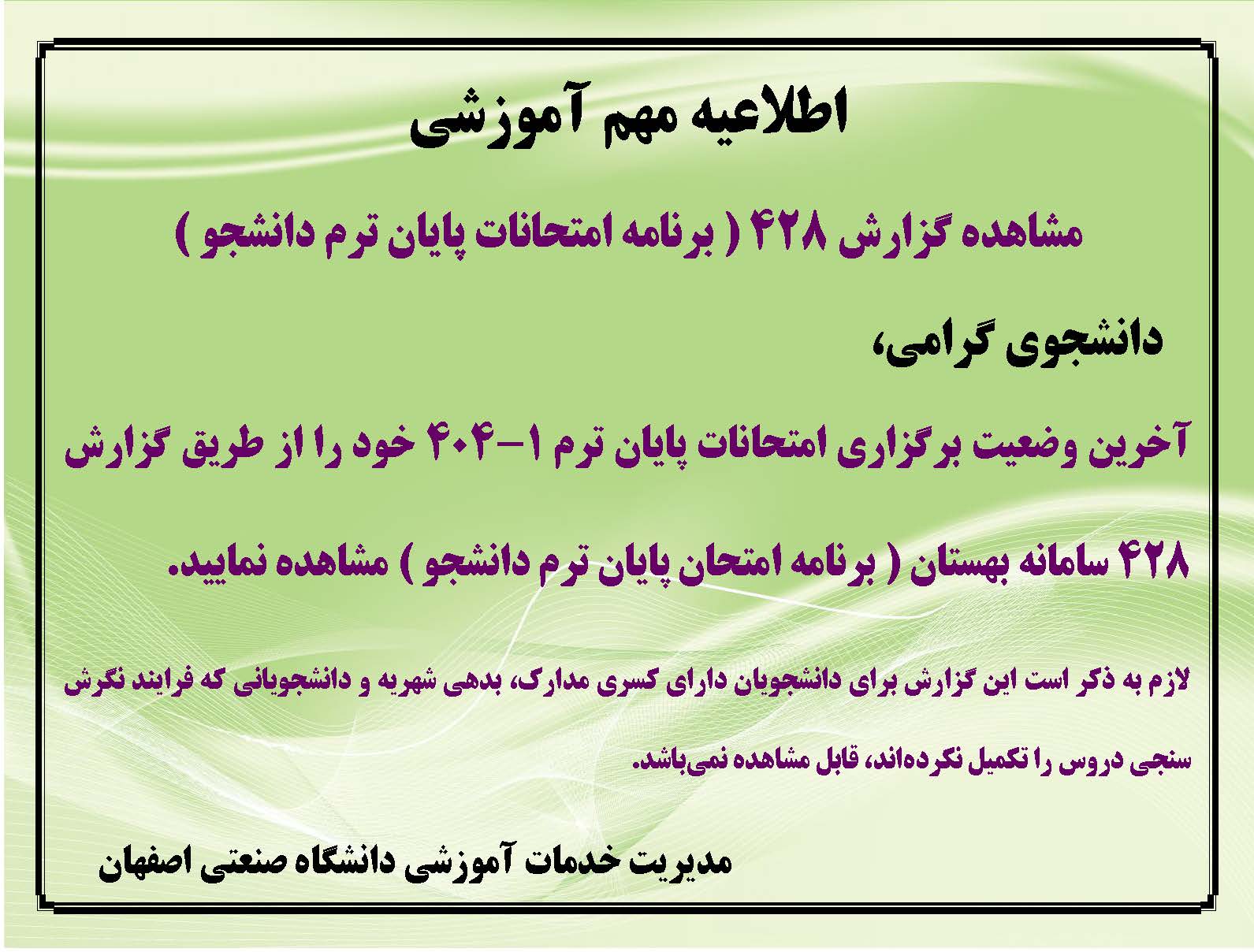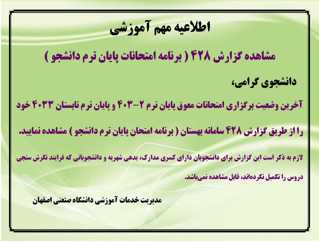 اطلاعيه مشاهده گزارش 428 -برنامه امتحانات پايانترم دانشجو در نيمسال 4041
