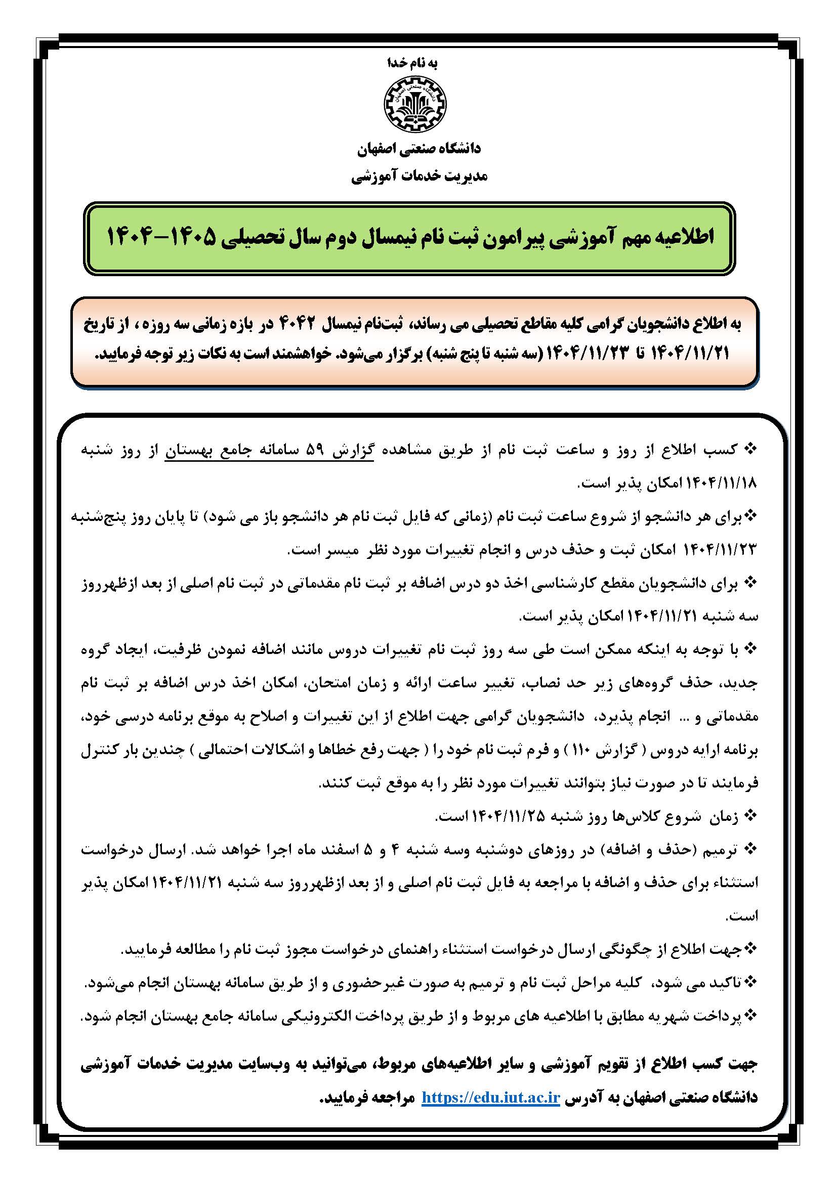 اطلاعیه مهم آموزشی پیرامون ثبت نام نیمسال دوم سال تحصیلی 1405 - 1404