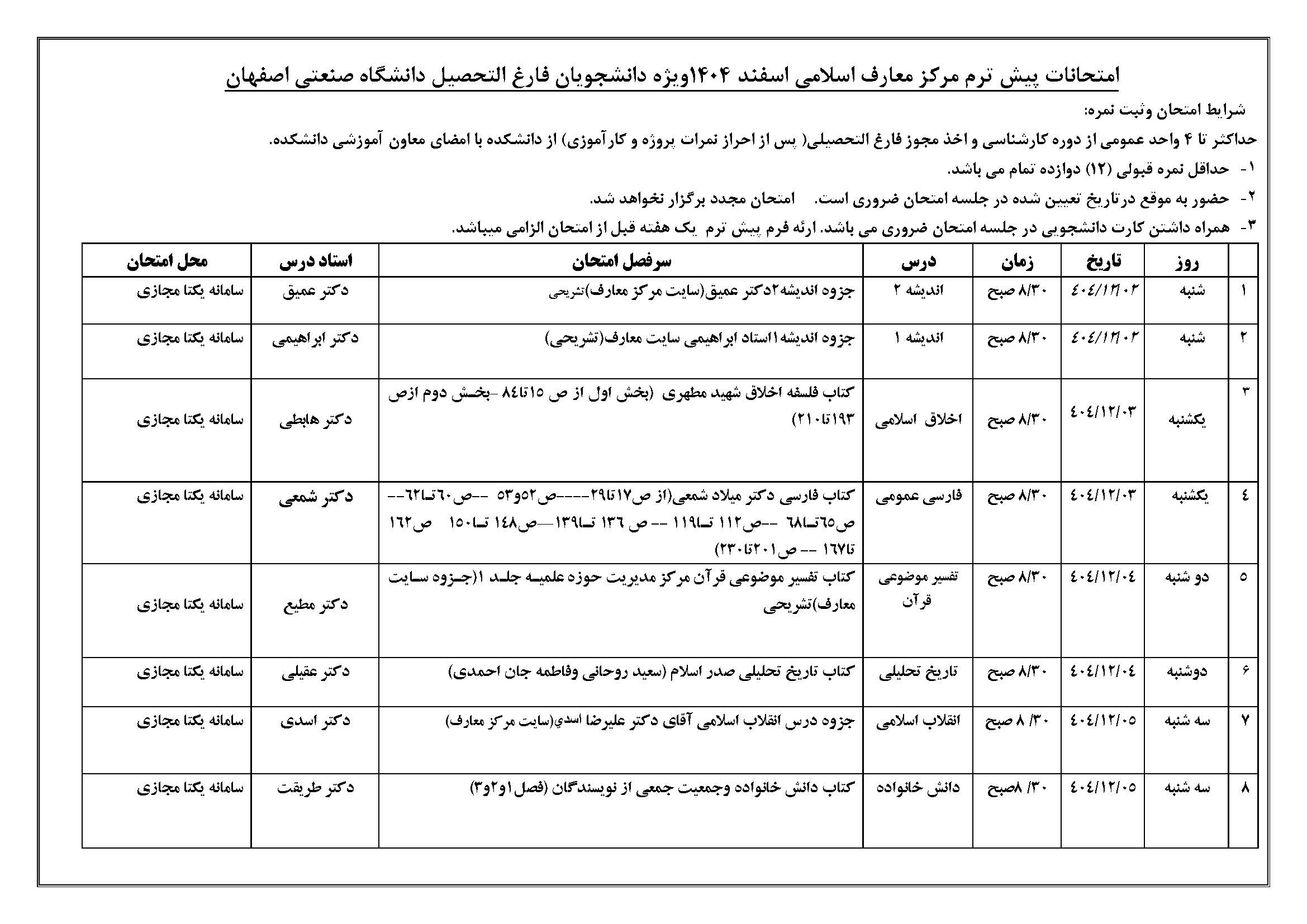 امتحانات پيش ترم مرکز معارف اسلامي اسفند 1404ويژه دانشجويان فارغ التحصيل