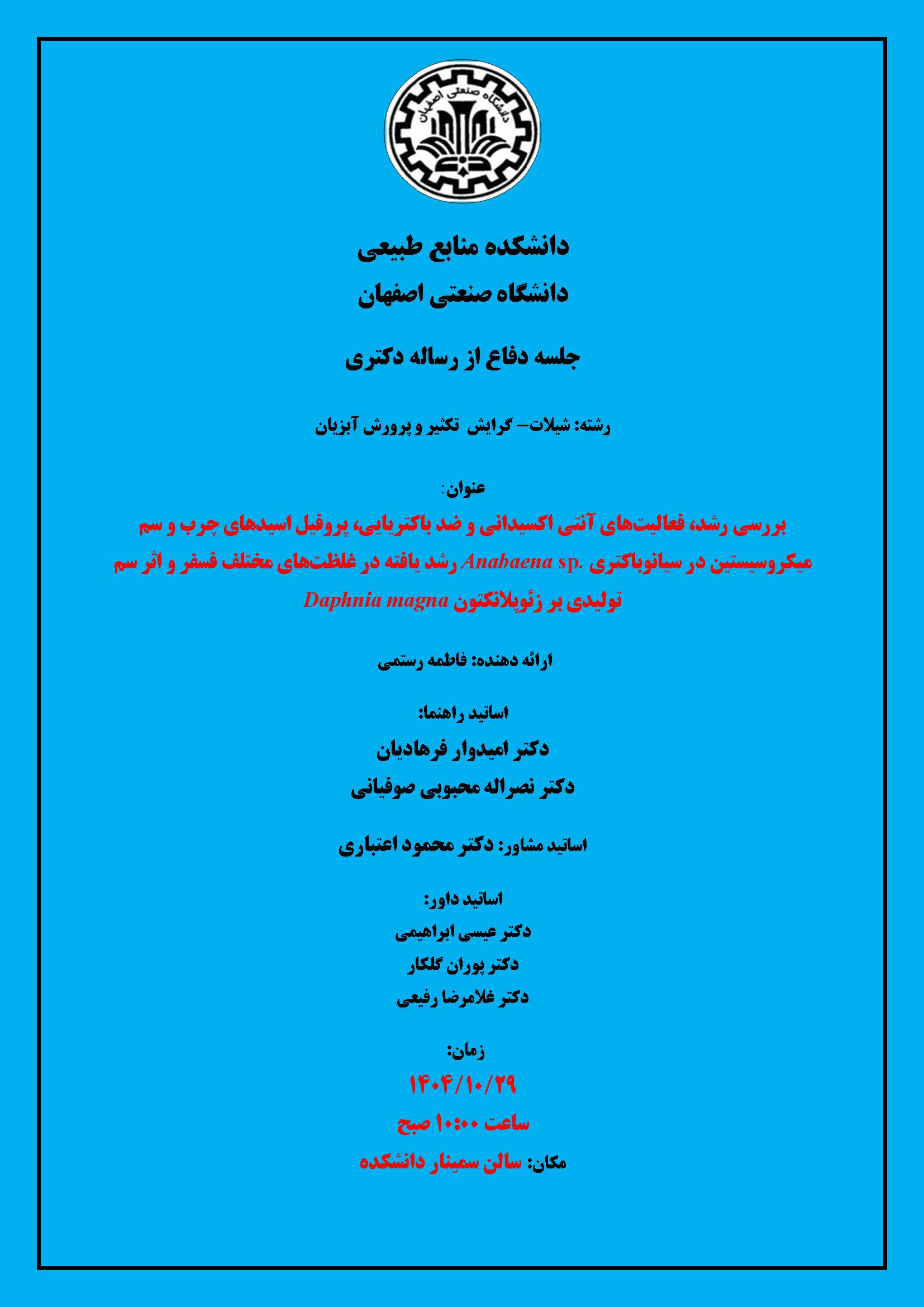 بررسی رشد، فعاليتهای آنتی اكسيدانی و ضد باكتریایی، پروفيل اسيدهای چرب و سم ميكروسيستين در سيانوباكتری رشد یافته در غلظتهای مختلف فسفر و اثر سم توليدی بر زئوپلانكتون