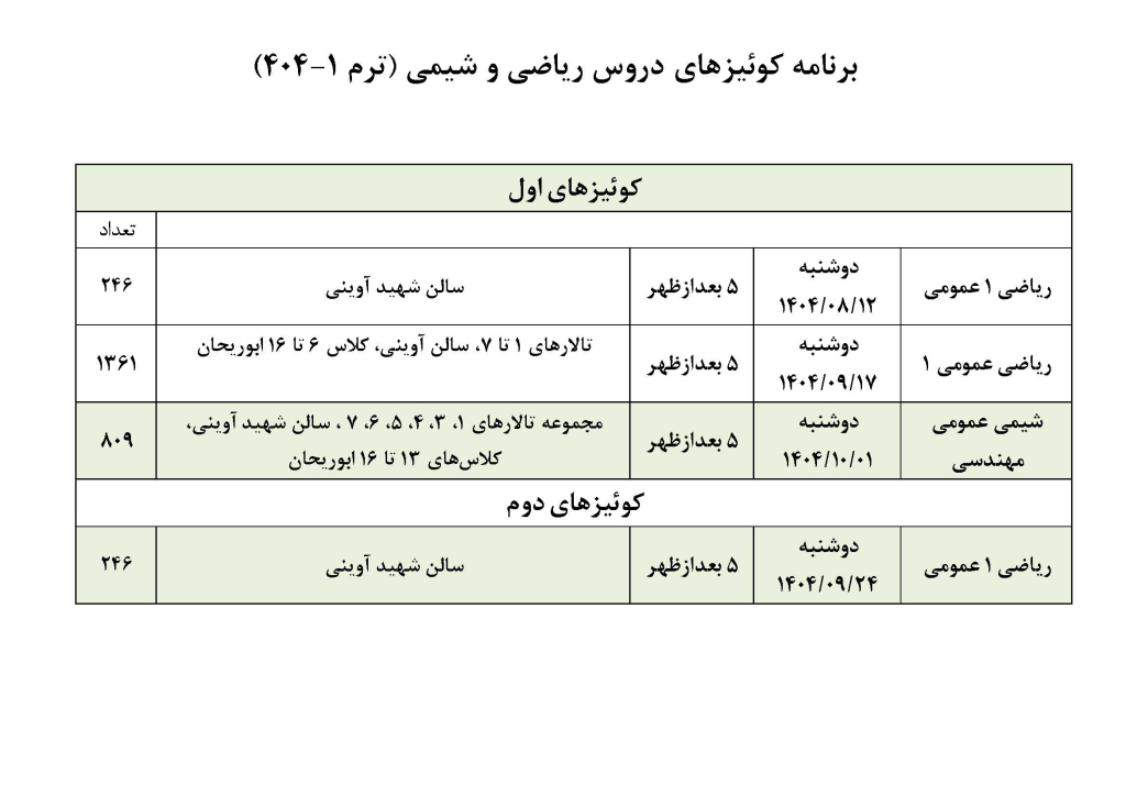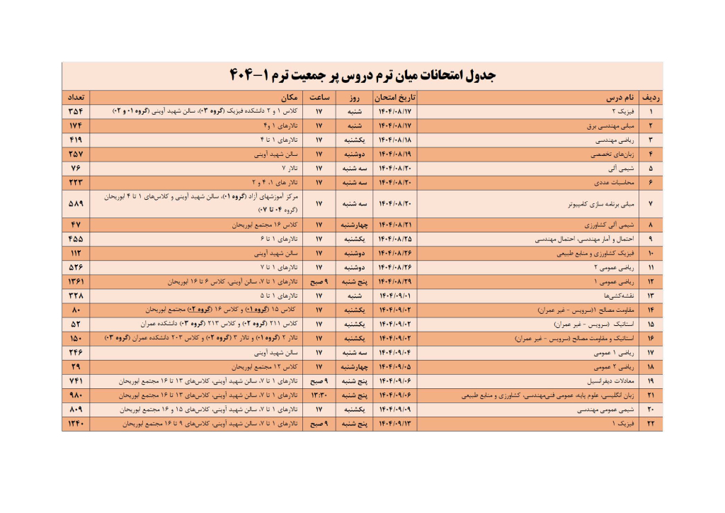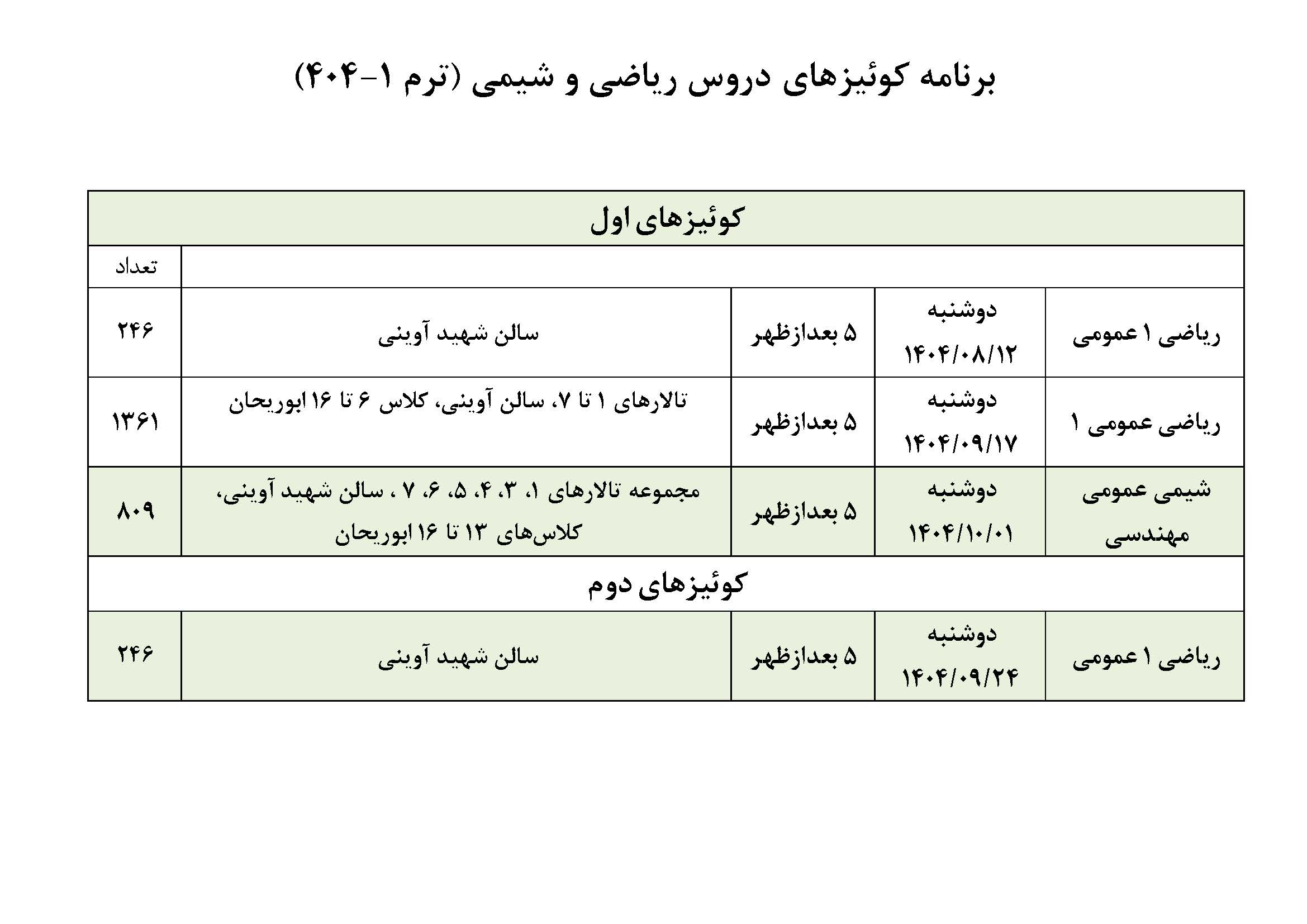 جدول امتحانات ميانترم و كوئيزهاي دروس پرجمعيت