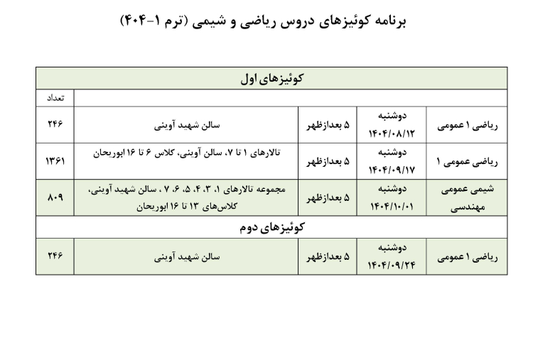 جدول امتحانات ميانترم و كوئيزهاي دروس پرجمعيت